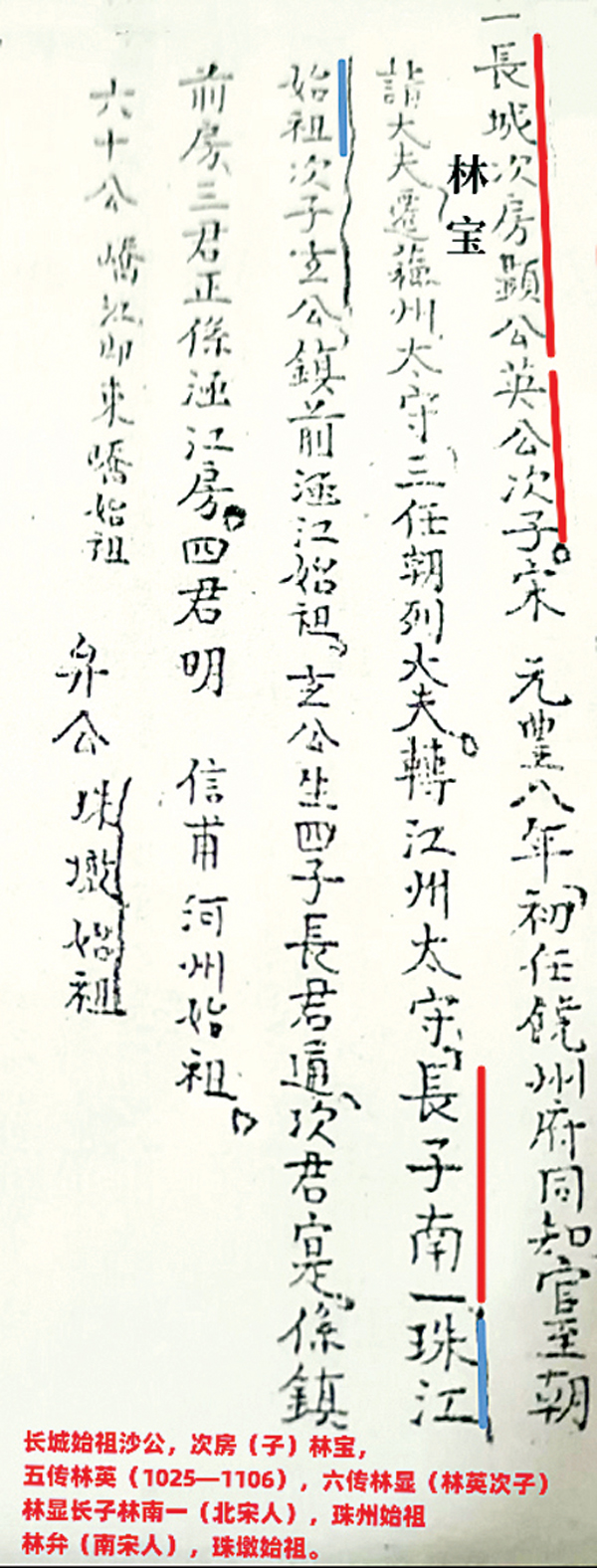 长城始祖沙公,次房(子)林宝,五传林英(1025—1106),六传林显(林英次子)。林显长子林南一(北宋人),珠江始祖。林弁(南宋人),珠墩始祖。
