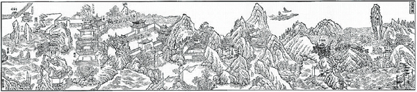 《敕封天后志》中“湄屿飞升”,图绘丁亥重阳日时,妈祖乘和风攀祥云,于山岩、水洞显灵示梦,乡里人建造祠庙祀祭这位“通贤灵女”。画面上部迂回盘绕的流云遮掩于局部的峰顶,立于云端的妈祖活络了人物形象的呆板单调,下部男女老幼均抬头仰视,仿佛在观看、见证妈祖的飞升,推远了湄峰空间上的距离。“……但见浓云横岫,白气亘天,恍闻空中丝管声韵叶宫徵直徹钧天之奏。……忽彩云布合,不可复见。”画面虚实之处,笔笔著意,一丝不苟,流云穿梭,以虚代实,精心地创造出妈祖飞升的从容形象。
