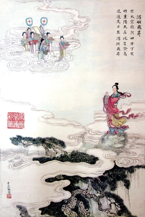 《周秀廷妈祖故事画册》“湄屿飞升”,描绘宋太宗雍熙四年(987),妈祖托言登高远游,在湄洲飞升的情景。画面以夸张手法着力塑造出登上湄峰最高处的妈祖形象,湄屿上空钟鼓、丝竹、管弦等齐鸣,声音悦耳,浑厚又悠远,直上云天。透视原理的视觉变化,表现出身材修长的妈祖朱衣之个性化形象,说明其凡间任务已完成,终于回归神界。
