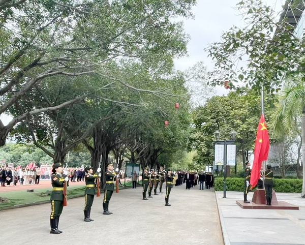 早上九点十分,纪念活动正式拉开帷幕,莆田四中国旗护卫队护卫着国旗,走过校园的大道。那整齐划一的步伐,是对历史的致敬;那坚定专注的眼神,是对未来的承诺。在激昂的国歌声中,国旗缓缓升起,那一抹鲜艳的红色在风中飘扬,如同燃烧的火焰。那庄严的升旗仪式,是对一二·九运动的深情回望,是对爱国精神的崇高礼赞。