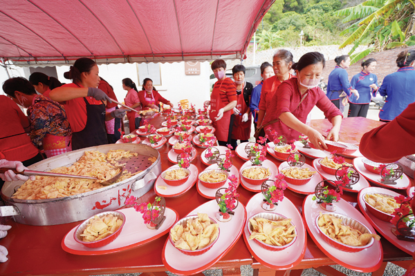 本届妈祖平安素食宴由“湄女汇”素食团队精心挑选天然食材,由豆腐、红菇、猴头菇、龙爪菌、羊肚菌、杏鲍菇、鹿茸、桃胶、竹笙、雪莲子等素菜食材烹调层叠制作而成的“五福喜盈门”“千帆竞上游”“金玉满明堂”“大地小阳春”“酸甜乐陶然”“福寿乐安康”“共尝明月沥”“八方来朝圣”“富贵团圆春”“杨枝话甘露”“吉祥如意至”等美食,展现出了素菜的独特魅力,让现场许多妈祖敬仰者啧啧称奇,争相拍照留影。
