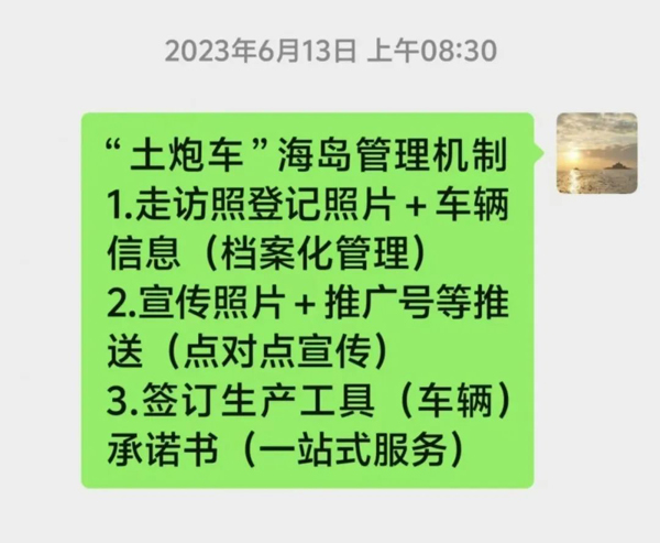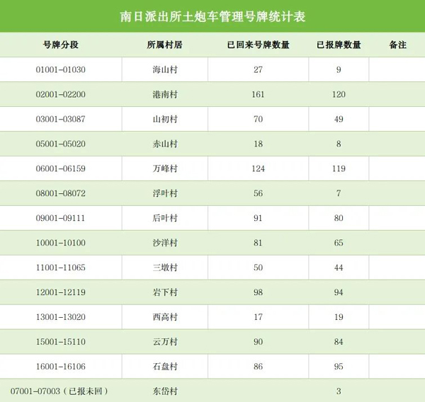(二)归档列管。镇道安推出“生产用车户籍化”管理办法,按村居分区编码设立“闽秀南农”岛内“土炮车”专用号牌,并明确要求各户在置换新车领取号牌时,必须同步报废旧车,实现旧车逐步淘汰。