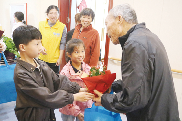 活动当天,在志愿者的热情引导下,长者及儿童走进百寿康老年公寓,沉浸式实景体验,观摩服务质量。还为公寓住户们精心准备了礼品和鲜花,由小朋友们排着队伍送到在住长者手里,连声说着“祝爷爷奶奶身体健康”,此时稚嫩的童声是世界上最美的语言,长者们绽放出幸福的笑颜。