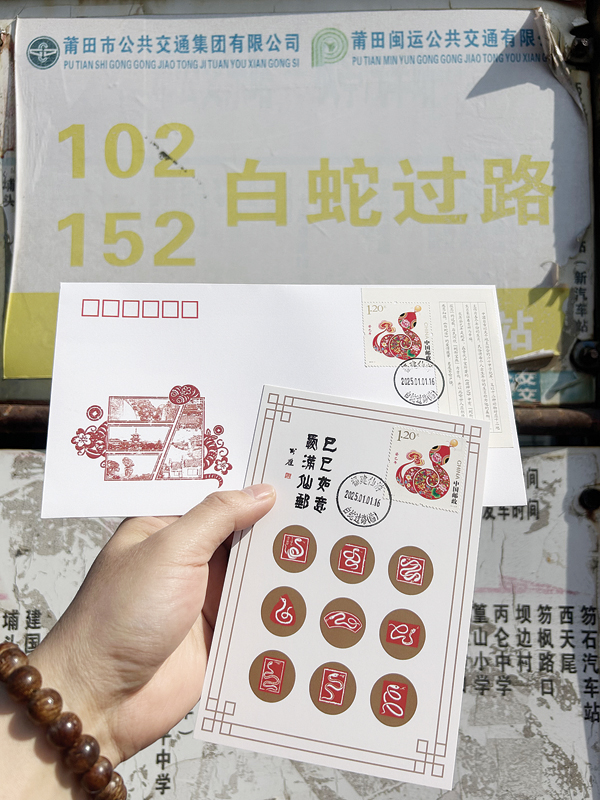 本报讯“找到啦,就在这里……”2025年1月1日,在仙游县枫亭镇白蛇过路公交站牌前,几位铁杆邮迷不约而同地呼叫起来,随后亮出各自精心制作的“白蛇过路”邮品,或打卡拍照留念,或拍摄视频分享。是日,中国邮政集团有限公司莆田市分公司发行PT9《巳巳如意· 爱满仙邮》纪念封片1套2枚,在枫亭邮政支局启用“福建仙游 白蛇过路(临)”日戳1种。纪念封以白蛇在四季中穿越九鲤湖、龙华双塔、菜溪岩、文庙等仙游四景为设计理念,明信片以传统纂刻呈现惟妙惟肖的白蛇,封片主题书法“巳巳如意 ·爱满仙邮”特邀福建省书法家协会副主席、莆田市书法家协会主席张煌题写。该邮品采用定制编号发行方式,首批芦阳斋版本的发行量仅为999套,此举开创了我省定制编号生肖封片的先河。