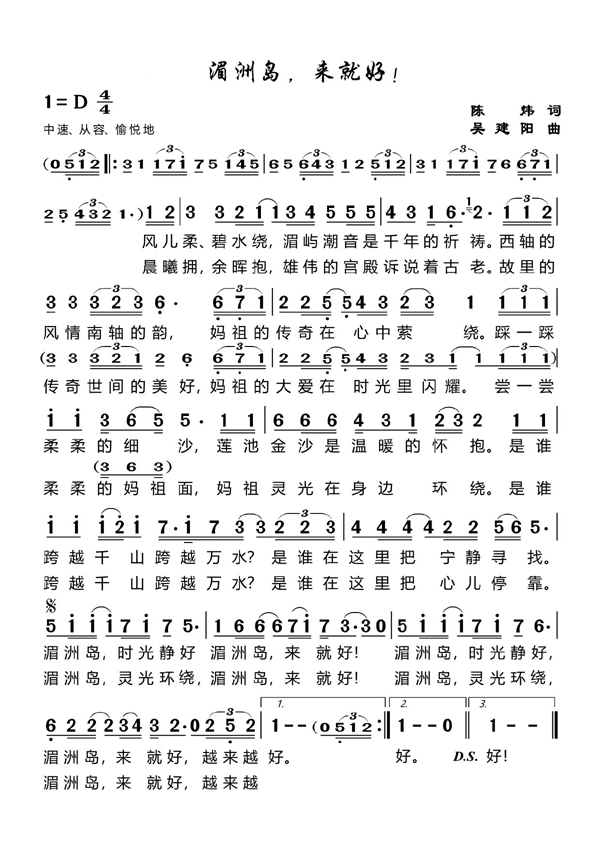 为了响应莆田市人民政府的号召,弘扬妈祖“立德、行善、大爱”的精神,进一步提升湄洲岛的知名度,促进当地文旅产业的进一步发展,莆田市词作家陈炜、曲作家吴建阳联袂创作了旅游形象歌曲《湄洲岛,来就好!》