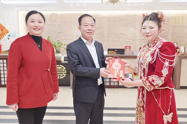 2月2日,来自台湾台北的王荞蓁女士远嫁湄洲岛寨下村,就此开启了一段充满爱与信仰的独特人生旅程。婚礼当日,湄洲妈祖祖庙董事会董事长林金赞满含关怀,以娘家人的身份参加接亲仪式,并为新娘送上新婚贺礼。