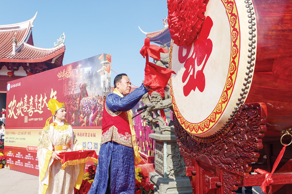 当天上午10时许,礼炮纷响,林金赞击鼓三响,10位鼓手紧随其后擂动大鼓,钟鼓齐鸣,迎春纳福。擂鼓迎春仪式结束后,林金赞携众人遵循礼制,敬备鼓乐,沐手拈香,以传统的“三献之礼”“八佾之舞”敬献妈祖。