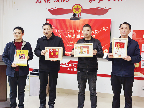 在仪式上,仙游县邮政分公司总经理柯双华介绍这套邮品的创作故事和打卡规则,该片精选本土摄影家的十二幅佳作,展示九鲤飞瀑、菜溪沟壑、麦斜仙境、天马悬梯、蜚山霜月、塔斗夕霞、凤顶无尘、仙洋戏水、石谷日出、仙游文庙、龙华双塔、艺都仙作等12处美景,通过钟山、榜头、八二五、枫亭、度尾、书峰、龙华等邮政网点和景区游客服务中心收集景点打卡章戳,兑换整套明信片和鲁艺香伴礼盒。八闽约投邮会副会长丁金怀向仙游县集邮协会赠送了以“幸福”集邮文创产品,深情回忆了打卡幸福邮局寄递幸福封片的美好往事,激发了与会者深度挖掘“邮”资源的热情。莆田市集邮协会为该县首个邮友之家鲁艺集团授牌,为该公司依托集邮平台助力红木产业、香道文化提供更广阔的发展空间。