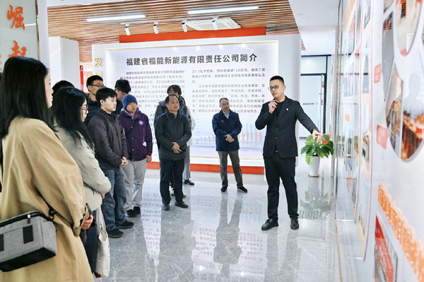 实践队一行人来到福能新能源公司,先后参观了该公司文化展厅、智能安全体验馆、集控中心,并详细了解了该公司发展概况、企业文化理念、绿色清洁能源储备项目规划等。