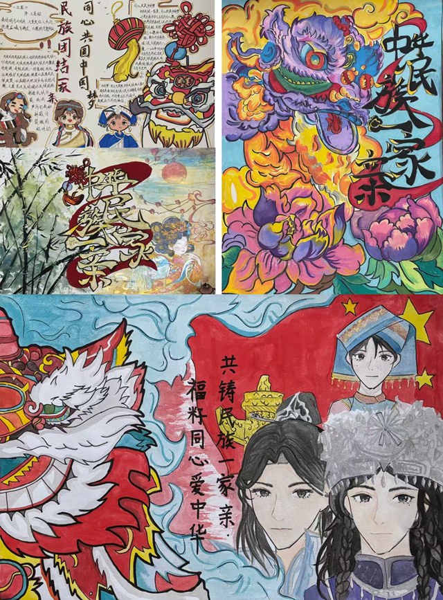 各班级通过主题班会分享民族文化故事与传统习俗,校园广播定时播放《爱我中华》等民族歌曲并讲解民族历史文化,使学生在课间沉浸式感受多元的民族文化魅力。七年级、高一年级同步开展绘画和征文比赛,学生以书画为载体,描绘民族团结图景、抒写对民族共同体意识的独特感悟,涌现出众多展现民族和谐共生的优秀作品。