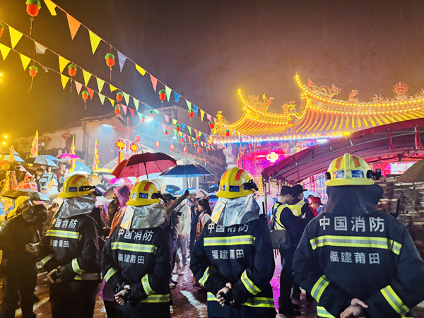 披甲枕戈、严阵以待,做好灭火救援工作。各地第一时间部署节日期间队伍管理和执勤备战工作,结合莆田元宵热度高、时间长、人流多等特点,因地制宜谋划安保方案,科学分布执勤力量到重要路段、重点区域、重要场点。期间,各前置备勤队伍时刻保持高度的警惕性和敏感性,采取“流动执勤+定点巡逻”的方式,圆满完成“上元祈福·万人圈灯”、“摆棕轿挑火闹元宵”、“摇橹行酒闹元宵”及各类庙会、灯会等系列特色民俗活动保卫工作,切实构建节日火灾防护的坚实堡垒。