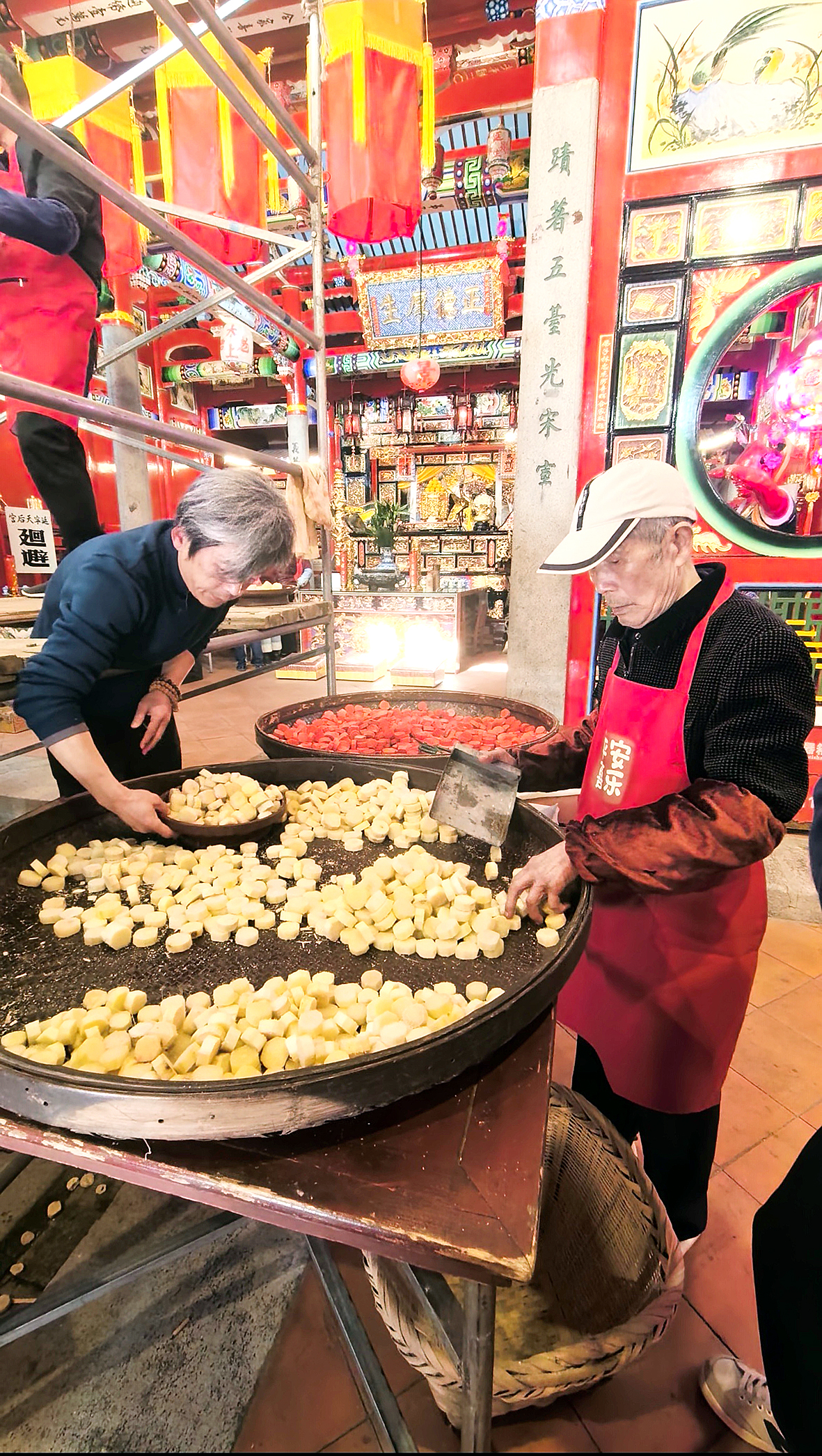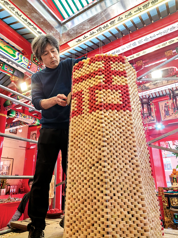 蔗塔由塔基、塔身、塔顶三部分构成,有4.2米高,整整365层,直抵天井顶部。塔基位于上下殿之间的大天井,上面放置着特制的带底托红漆八角形果盒,就像给蔗塔打了个稳稳的地基;塔顶是一块八角形木板,制作时作为参照,完成后成为顶端盖板,板上叠放着4个福桔,插着带有吉祥语花样的红色剪纸,还装饰着象征迎春纳福的“三春”纸扎。塔身是蔗塔的主体,全部由甘蔗节搭叠而成。从正月十三开始动工,搭叠过程极为讲究。师傅们选用190多公斤重且糖度高的新鲜甘蔗,削皮后切割成1.2厘米厚的圆形蔗节,部分还要染成红色。施工时,从塔顶顶板中间垂下千金坠与果盒中心相对,再用线将顶板八角与果盒八角相连,这九条线便是搭叠塔身的“定海神针”,如同泥瓦匠砌墙时的牵线。搭叠过程中还需错杂红色蔗节,增添喜庆氛围。这是个精细活儿,既考验技术,又需格外小心,师傅们经过三天的默契协作,才完成蔗塔的搭建。