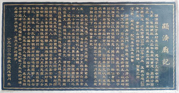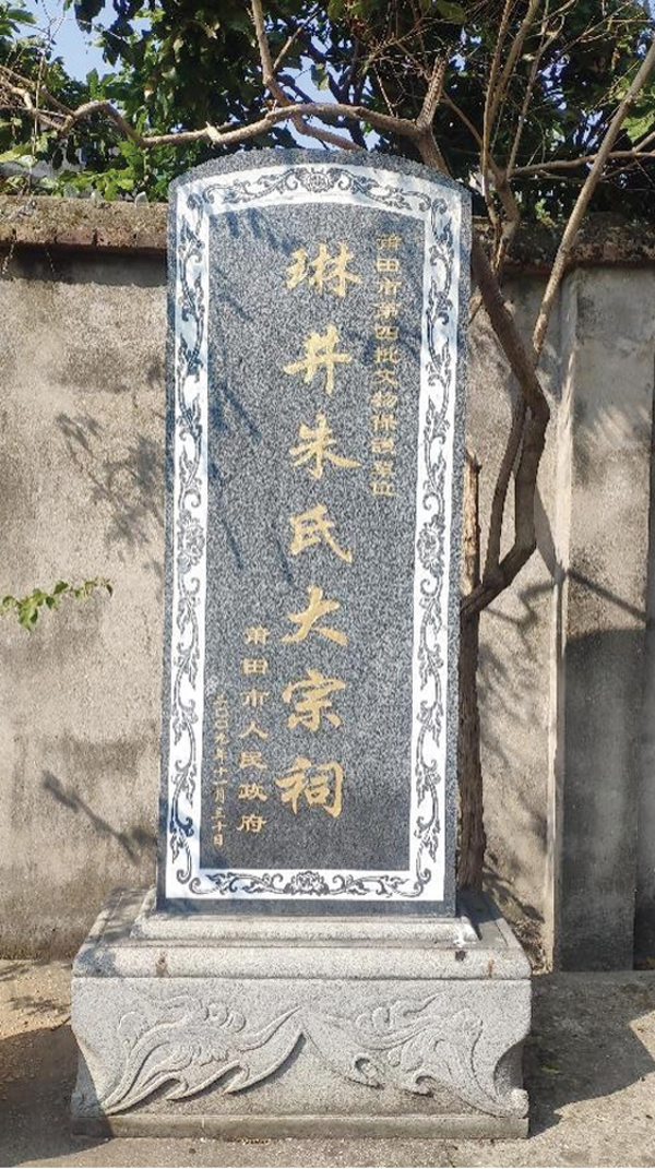 《莆田朱氏通谱(第三卷)》第876页“第二章 人物传”里载:“朱默(1065—1086),字感通,黄石井埔人。相传,朱默出生之日红光绕室,举家惊异。身材英俊魁梧,奇伟赋质,由于天纵倜傥自非常人。偶一日之间出没变化人莫测其机,众皆称默为神。……高宗即制诰敕封朱默彰烈嘉佑侯,并差扬名主事督庙并赐联:天相朱门荷栋梁之重任,地雄黄石恢世代之弘规。理宗宝祐四年四月,敕默为佐神朱大夫,特封灵威侯。宝祐四年八月,加封灵威嘉佑侯。其后家家香火遍福泉,威灵复显著于临漳。”此记载虽没有朱默、朱黓兄弟等人,但朱合浦先生在《收伏嘉应嘉佑》一文中提及其和柯凤梅陪同台湾蔡相煇教授赴黄石井埔(俗称“琳井朱”)考察,得到著名画家朱成淦所谓“嘉应、嘉佑就是我们朱氏祖先朱默、朱黓,供奉这二神的显济庙就在我家旁边!”之言,并礼请朱氏带领去参访显济庙,调查期间蔡教授进一步大胆猜测:“有可能妈祖在生时已经开馆收徒,传授她的经验和知识,朱默、朱黓兄弟俩正好是她的徒弟……所以后来才顺理成章做了妈祖的陪神,收伏故事不过是一种假象而已。”诚然,作为妈祖的陪神,宋代朱氏兄弟同样是“由人而神”,并不是什么妖怪。近期,笔者拜访黄石镇井后村井埔541号的琳井朱氏大宗祠,进门上的“唐古田令朱公祠”字额之两旁分别刻有“公元2010年岁次庚寅重阳,朱成淦长孙朱元国题”,联题“地纪莆阳忠孝节廉羡我祖光前裕后 堂名琳井师儒将相望吾宗继往开来”。值得注意的是,朱氏大宗祠内墙壁嵌刻的《琳井朱古田令祠堂记》载:“……朱于莆始有祠,祠于望江岭。五傅而宣义德公从井埔。又四传大夫默公与其弟黓及妹,没著灵异。建炎四年,高宗南渡,中流风作,显神功护舟,自言封默‘威烈’,封黓‘嘉烈’,皆侯也。于(呜)乎亦异矣!已而加封显福彰烈,赐庙曰‘显济’。于是分望江井埔曰:‘上下庙云’。……”此与明代黄石人、南京户部左侍郎邹守愚《俟知堂集》中的《朱氏古田令祠堂记》内容稍有不同。该祠埕侧壁存立有“唐古田令朱公妣 勅封恭人萧氏墓”“宋神医朱先生”两通碑刻。