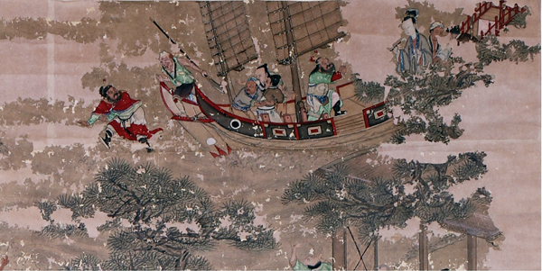 清代欧峡《天后圣迹图》轴中“收伏二怪”画面,描绘妈祖手握拂尘立于船舶的尾部。据《天妃显圣录》“收伏二嘉”故事可知,前面有位绿衣模样的人即嘉应,正向妈祖作揖行礼。船头的水面上有个红衣将军模样的人即嘉佑。图像中的妈祖、船舶及布局等构思巧妙,不同身份与性格特征的人物形象和谐完整,并无局促之视觉空间感。清代大幅水陆画与中国国家博物馆收藏的《天后圣母事迹图志》“破魔道二嘉伏地”“净魔心乘舟显圣”画面、仙游枫塘宫《天后显圣故事图轴》“收伏二怪”等画面,在经营位置上均反映出简洁紧凑的章法,将人物和景物融合一体,多以自然山水为背景,营造出一种“道法自然”的叙事氛围。设色清新淡雅,趋于文人画之特色。用笔线条流畅,人物造型活泼,具有明清典型的仕女画风格特征,颇见南北方民间美术创作者的功力与修养。