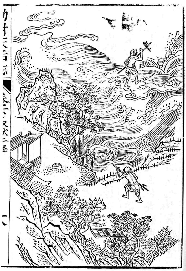 清道光六年《天后本传》中“邪魔反正”,描绘妈祖收伏嘉应、嘉佑二怪为其部将的故事。画面中二嘉同时出现在妈祖的船前,与收伏千里眼和顺风耳的场面近似。画面那些有节奏的波浪律动,暗示正邪双方正在进行较量,妈祖拂尘轻扬,邪魔即刻反正。该图中有题记:“……后大施法力,乃悔罪请宥,并收为将,列水阙仙班,共有一十八位。”