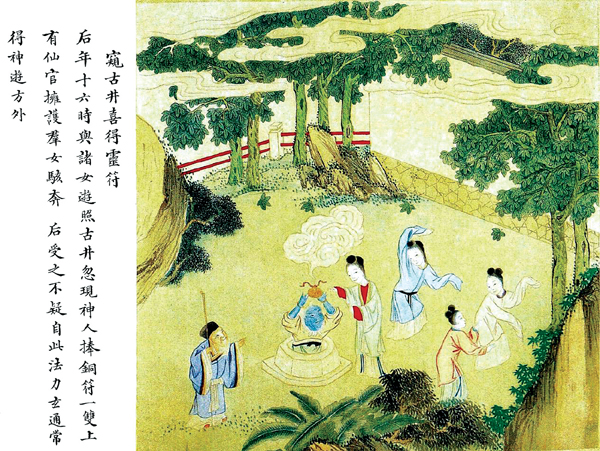 《天后圣母事迹图志》中“窥古井喜得灵符”取偏僻后花园的一角地方,周围绿树成荫,清静安谧,其余略同。人物刻画细致,色彩淡雅,画面用色偏素雅,增添祥云群树等意象性的事物,加强了窥井得符神话的色彩。