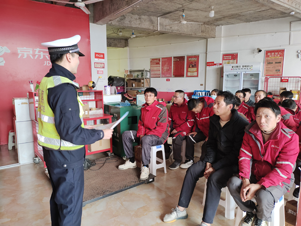 本报讯 为强化快递物流行业交通安全管理,进一步提高从业人员的交通安全意识、守法意识、责任意识,从源头上预防和减少道路交通事故的发生。3月3日,交警大队榜头中队走进京东快递进行交通安全宣传活动。