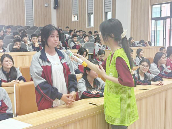 本次活动打破了传统的宣教模式,创新性地开展“沉浸式调研”,构建起富有吸引力的互动场景。在 “吸‘聪明烟’,一点都不聪明!”主题环节,讲解员李舒涵展示了伪装成电子烟、糖果的新型毒品模型,瞬间激发学生们的热烈讨论,现场气氛十分活跃。紧接着,在“青春无‘毒’局,未来不‘瘾’藏”访谈活动中,讲解员翁静茹与六名学生代表围绕毒品预防展开焦点讨论,深入交流对禁毒的理解和看法。这种情境化应对策略,通过沉浸式体验,让在场师生产生了强烈的共鸣,获得了高度认同。