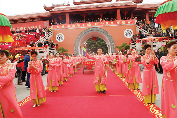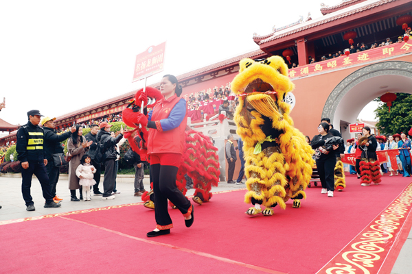 “擂鼓迎宾,恭迎天下妈祖回家!”活动现场,号手、鼓手、旗手和提红灯湄洲女整齐列队,迎接海内外进香团。
