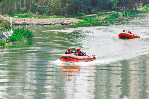 演训模拟荔城区黄石镇一河流因近期多轮强降雨天气引发洪涝灾害,支队接到报警后,立即调派支队水域救援专业队,55名指战员、12辆消防车、13艘舟艇、1050件(套)水域救援装备器材参加拉动演训。拉动过程重点对车辆、船艇、防护、救生、破拆、通信、排水等水域救援器材装备进行点验,现场随机抽查参战指战员对装备器材性能和操作方法的掌握情况,并结合真实水域复杂环境,科学设置水域桥降、水中拖带救援、水面绳索横渡救援、水上机器人救援和激流舟艇(IRB充气式机械动力救援艇)驾驶基础技术等科目全流程模拟实战开展救援行动。