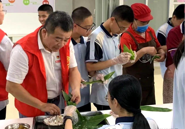 最温馨的环节当属党团共建包粽子活动,师生们围坐桌前,在粽叶翻折、糯米填充中体验民俗乐趣。劳动不仅是技能的传授,更是审美与创造的体验,当粽叶在指尖翻飞,糯米在掌心流转,传统技艺的独特魅力悄然绽放,文化的温度也随之传递。
