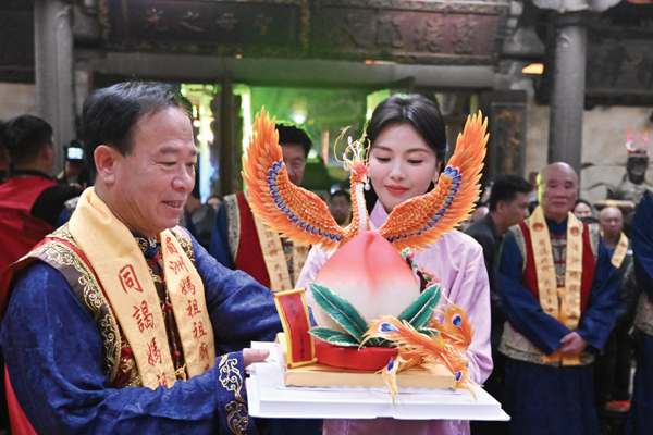随着时间的推移,知名演员、妈祖文化全球推广大使刘涛从湄洲女手中接过托盘,拾阶而上,将“寿桃”蛋糕敬献给妈祖,向妈祖表达最真挚的敬意与虔诚的祈福,也将现场的活动氛围推向最高潮。