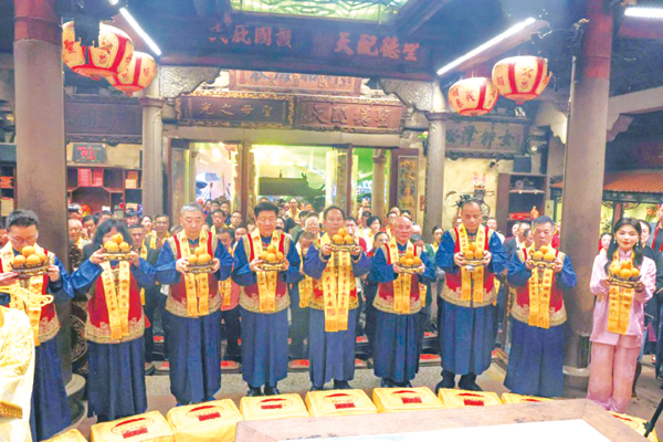 23时40分,中华妈祖文化交流协会副会长、湄洲妈祖祖庙董事会董事长林金赞,泰国中华总商会主席林楚钦,湄洲妈祖祖庙董事会荣誉董事长、上海玉成天赐珠宝有限公司董事长赵柳成,湄洲妈祖祖庙董事会荣誉董事长、莆田市大金鞋业有限公司董事长李鸿飞,侨鑫集团副董事长周素珍,台湾嘉义新港奉天宫荣誉董事长吴富翔,台湾中华文教艺术基金会主席许伯夷等嘉宾,携手祖庙全体董监事、值年福首及海内外妈祖敬仰者,遵循礼制,举行庄严的三献仪式。
