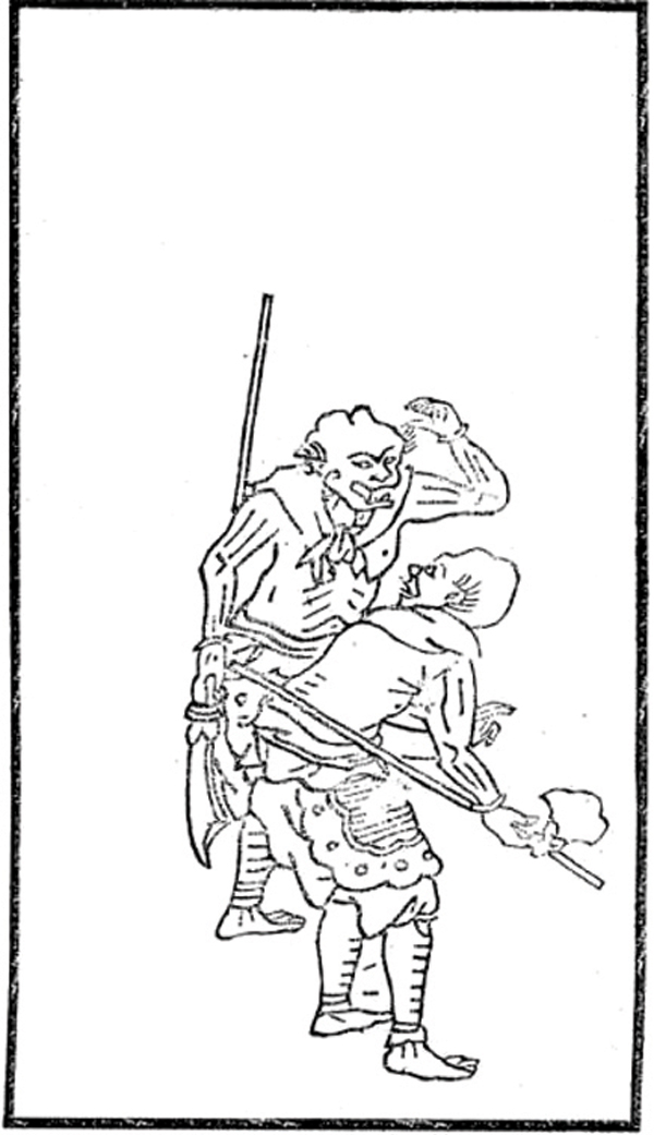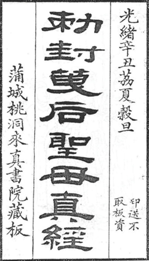 清末周宗坊刊本《勅封天后圣母真经》为地方所印经书。书的封面上,妈祖头戴冕旒,手捧宝圭。侍者头戴翘角濮头,手持宝扇。线条概括,有粗犷简放特征。