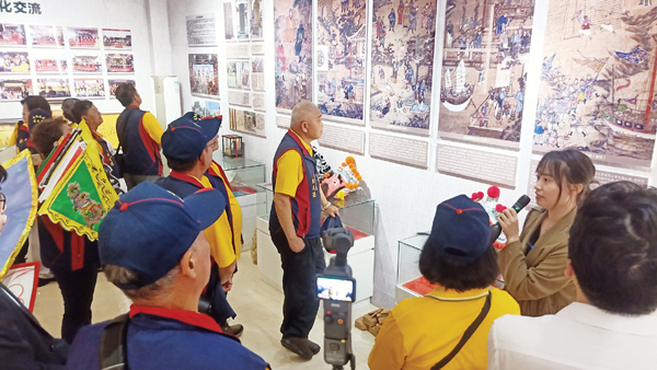 午后,台湾谒祖团在福建省同心文化推荐官林忆媚的引导下参观了东进村非遗文化展览馆。清代《五帝回鸾万民庆》、隋代砖以及两岸往来文书等10件文物,实证了“人同根、神同源”的文化联结。在“同根共祈”互动环节,莆台书法家联袂创作了“五帝道统 肇始东汾”“同根共祈”“神缘福禄寿”等墨宝,台胞们亲笔签署五帝祈愿文书,共祈平安,体验了传统文化的魅力。