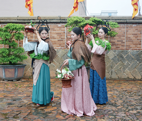 活动核心环节是依据东汾五帝祖庙馆藏明代水陆画《五帝降鸾图》复原的五帝三献礼仪式。该仪式严格遵循古画规制,分为初献敬天地、亚献祭神明、终献颂祖德三阶段。莆台主祭人依循古礼,行三跪九叩大礼,共同祈愿风调雨顺、国泰民安。仪式全程包含沐手拈香、恭读祝文、行献礼等传统仪轨,完整呈现了五帝信仰在莆台传承的历史脉络。古装仪仗队中,三位身着古代祭祀服饰的礼生手持果篮礼器,生动还原了古画场景,展现了中华传统礼仪的庄重典雅。