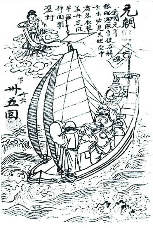 《妈祖文献资料》第11页中宋丁伯桂《顺济圣妃庙记》载:“开禧丙寅,金寇淮甸,郡遣戍兵,载神香火以行;一战花黡镇,再战紫金山,三战解合肥之围。神以身现云中,著旗帜,军士勇张,凯奏以还。”南宋抵抗金兵入侵的三次战斗,军士们随身携带妈祖香火神符上阵迎击金兵,两军交战,士兵声称看见妈祖现身云间,挥舞军旗助战,一举解了合肥之围并取得胜利。清代《天后圣母事迹图志》之“助阴兵金人碎首”、清代《天后显圣故事图轴》的设色画面中,宋将利用水师官兵敬仰妈祖的心理鼓舞士气,使其奋勇作战。《妈祖文献史料汇编》第94页中《天妃显圣录》之“平大奚寇”记载:“与贼遇于中流,彼居上风,难以取胜。众祷于神曰:‘愿藉神力扫妖氛,上慰天子讨叛之心,下救万民蹂躏之苦。’顷刻间昏雾四塞,返风旋波,神光赫濯显现。”宋景定三年(1262),海寇作乱于兴、泉、漳之间海城,官兵得到妈祖神助,在莆田湄洲一带海域擒获海寇。