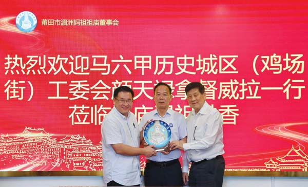 日前,马六甲历史城区(鸡场街)工委会颜天禄拿督威拉率队赴湄洲岛谒祖进香。湄洲妈祖祖庙董事会董事长林金赞对众人的到来表示热烈欢迎。