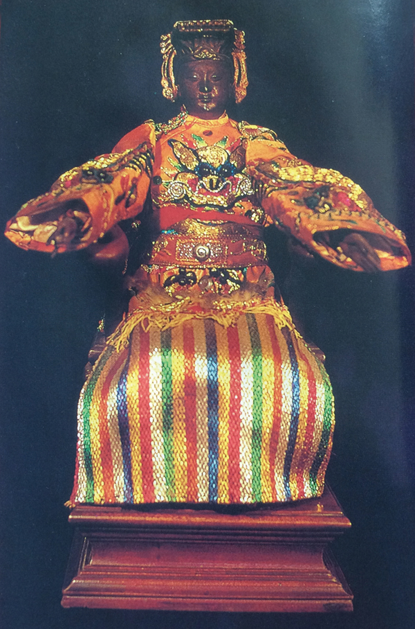 台湾大甲镇澜宫妈祖像,软身坐姿,面部丰满祥和,凤眼俯视前方,头戴十二旒冕冠,冠体较宽,身着黄色龙袍,肩披珠编云肩,外披黄色霞帔。双手盘靠、十指互拱,并列放置龙椅之上。神像双眼垂睑下望有慈悲、内敛的气质,左右随侍的是她的侍女。据说二次大战期间,盟军丢下两颗炸弹在大甲街上,一颗炸断火车站一带;一颗未爆弹落在妈祖庙旁的市场边,当时镇殿妈祖手脚身体都可以自由转动,其双手是张开的,民间流传是镇殿妈祖显灵接炮弹,才使镇澜宫城内一带没有受到炸弹损伤。