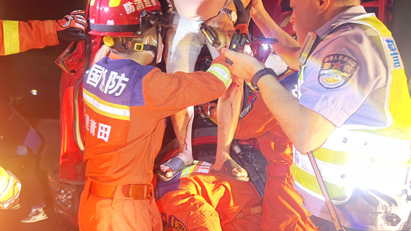 到达现场后,消防救援人员发现,现场为两辆货车追尾,后车追尾后撞上护栏,后车左侧车门和车头部位严重变形,且挡风玻璃已完全炸裂,使其驾驶员腿部卡在方向盘下无法动弹。根据现场情况,消防救援人员立即制定好救援方案,一组人员利用液压破拆工具组解救被困人员,另一组人员负责配合交警做好救援现场的警戒工作。随着救援行动的展开,经过约10分钟的紧急处置,该被困人员成功被救出并由现场医护人员送往医院进行治疗。随后,消防救援人员将现场移交给交警后,收整器材撤离现场。