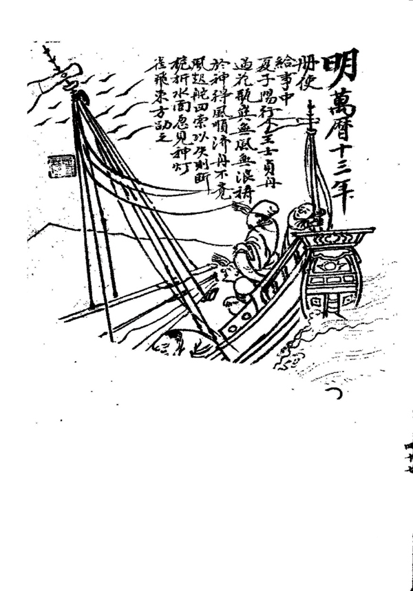 《勅封天后志》中“历庇封舟”载:“虔祷之次,俄有一燕、一蜻蜓飞,绕船左右,遂得易柁,舟乃平安。”萧崇业,字允修,号乾養。明万历七年(1579)为户科给事中充任册封琉球正使。萧崇业不仅撰有《重修广石庙碑记》《祈报海神》《谕祭报海神文》和《谕祭祈海神文》,还与副使行人司行人谢杰合编《使琉球录》。谢杰,字汉甫,福建长乐人。明万历二年(1574)进士,官至户部尚书。谢杰的《敬神》亦讲:“航海之神,天妃最著。……使者往还,每值风发,必有先征:或为蜻蜓、蛱蝶,或为黄雀、红灯笼,令人得预为之计。”