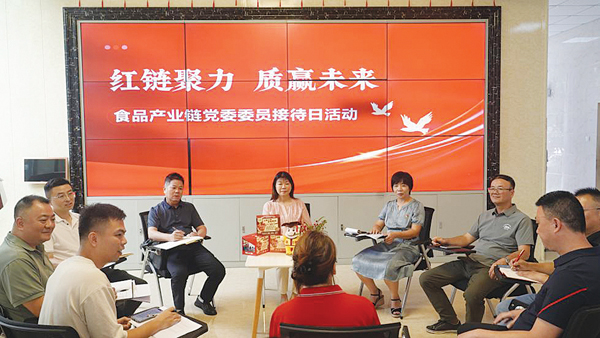 本报讯 为进一步畅通政企沟通渠道,精准破解食品产业链发展堵点难点,近日,城厢区食品产业链党委组织开展“红链聚力 质赢未来”食品产业链·党委委员接待日活动,邀请省政协委员,市场监管局、链上委员单位等职能部门相关负责人现场坐班,与10余家食品产业链上企业代表面对面交流,倾听企业心声,共商发展良策。