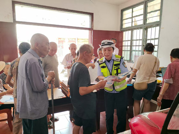 本报讯 为进一步做好农村道路交通管理工作,切实增强广大群众的交通安全意识和自我保护能力,有效预防和减少道路交通事故的发生,8月11日,仙游县公安局交警大队榜头中队结合夏季交通安全整治行动,走进辖区仙水村,开展交通安全宣传活动。