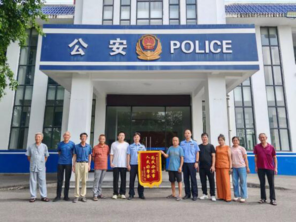 8月12日,梧塘镇松东村的刘大伯在镇村干部及家人的陪同下,给梧塘派出所社区民警环义光送来了一面写着“为民办实事 人民好警察”的感谢锦旗。