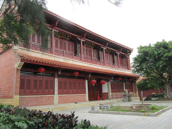 大殿的屋顶脊中段有玻璃瓦和五彩瓦片粘成的双龙戏珠;脊端和重檐之间雕彩各种飞禽走兽、花卉人物,栩栩如生。殿前有一对青草石雕龙柱,据传系郑成功宿校师徒二人所制,二龙飞腾,搏浪驾云,巧夺天工。门前侧立着两尊石狮,威武传神。