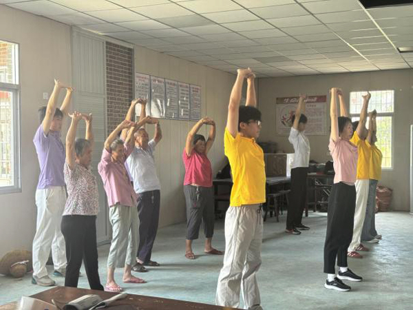上午十点,伴随着悠扬的《行云流水》古琴曲,志愿者列队展演八段锦。“调理脾胃须单举”、“双手托天理三焦”……一招一式刚柔相济,舒展的动作与舒缓的音乐相得益彰,吸引了众多村民驻足围观。81岁的林阿公忍不住跟着比划起来:“这比广场舞轻松,练完浑身舒坦!”展演结束后,志愿者们分组带领村民学习基础动作。他们摒弃专业术语,用“抬手像摘果子”、“弯腰似拾麦穗” 等充满乡土气息的生活化比喻讲解动作要领,现场笑声不断,学习氛围格外融洽。