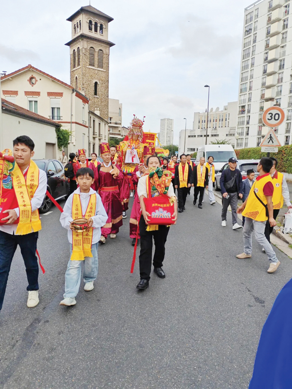 远在巴黎的莆田籍乡亲早早就在法国妈祖文化联谊会会馆路口等候。妇女们身着莆田节庆专属的红色盛装,发间簪着极具莆仙风情的月季柏叶簪花;精心彩排多日的锣鼓队严阵以待,仪仗队员们身着传统执事服饰,手举妈祖宫灯与警避牌,已经适应法国生活节奏的孩子们也跟着父母,静静地在等候故乡妈祖的到来。当分灵妈祖抵达的那一刻,现场热闹喧天;仪仗队伍引领着分灵妈祖及千里眼、顺风耳等神尊缓缓进入联谊会会馆妈祖行宫。行宫内早已备好了具有莆田特色的五果六斋。