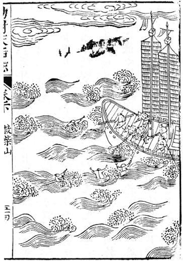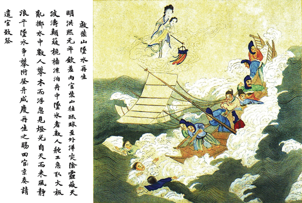 《勅封天后志》卷下“救柴山”载:“至外洋,一夕云雾晦冥,山方假寐,梦神抚其几曰:‘若辈有水厄,当慎之,吾将为汝解。’”明洪熙元年(1425)四月,钦差内官柴山往琉球办理公事,航行船上供奉妈祖香火,打盹时梦见妈祖拍案说将为其解难,指挥官及时借助空中神灵显迹的神威精神,鼓舞将士有神力庇护,军心大振,奋勇向前,最终获得大胜。海面波涛汹涌,绘者显然有意呈现整个海洋的景观。散落式的位置构图,不让画面有大面积的空白,落水者的布局,见缝插针,添枝加叶,突出航海者遇难时得妈祖神庇,最终战胜灾难并赢取生机。此事在《天妃显圣录》之“琉球救太监柴山”一节中亦有记述,后来柴山感神灵救护之恩,曾在琉球唐营重修天后宫,复在宫南建筑千佛灵阁。