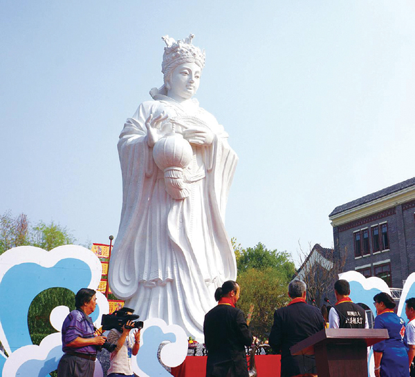 山东庙岛显应宫之石雕举灯妈祖像