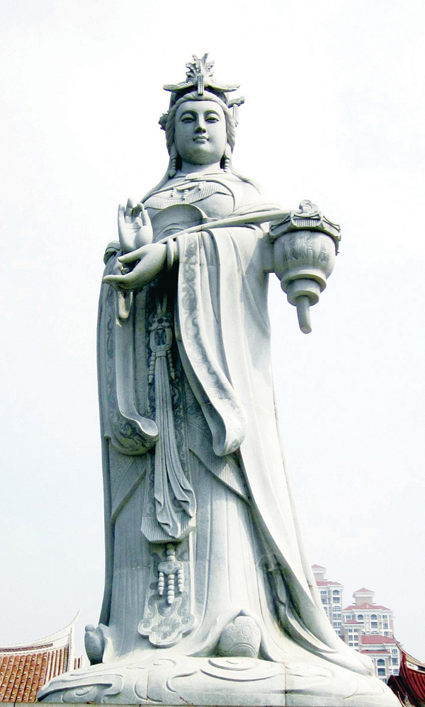 山东庙岛显应宫石雕举灯妈祖像,以高举神灯济世,展现人体动态美,表示拯救众生海难之苦的本愿,此硬身立像用坚硬的岩石为底座。