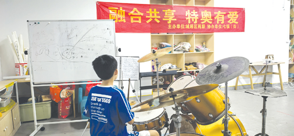 非洲鼓的欢快节奏、架子鼓的铿锵节拍,蓝色灯塔老师指导的“星青年”乐队,用专注演绎着对生活的热爱,台下掌声经久不息;另一边,城厢义工协会的陈玉英非遗传承团队正手把手教孤独症青年掐丝珐琅技艺,工作台前,孩子们屏息凝神地粘胶、细致上色,当灯光映亮亲手完成的花瓣图案,稚嫩的脸上扬起了满足的笑意。