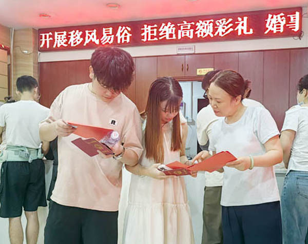 现场还摆放着婚俗新风宣传展板,工作人员为新人发放《婚俗新风倡议书》《婚姻家庭经营指南》等资料,并为新人解答婚姻相处、家庭沟通等方面的疑问;卫健部门工作人员也同步提供健康婚育知识宣传,从婚前保健到科学育儿,为新人送上实用的“婚姻第一课”,引导大家树立“重感情、轻物质”的理性婚恋观。