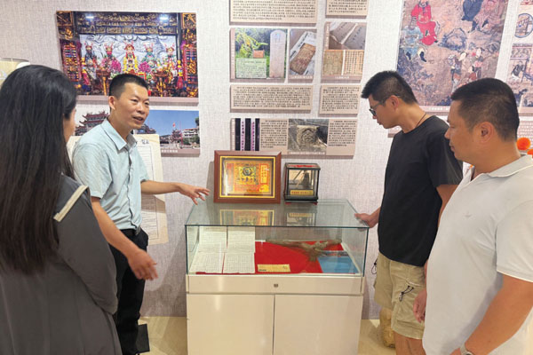 座谈会后,与会人员在驻村第一书记林巍的带领下参观了东进村非遗文化展览馆。展览馆陈列了丰富的具有地方特色的非物质文化遗产与文物,包括闽台送王船、皂隶舞、傩面具传统技艺、草鞋制作技艺、抗倭文物等珍贵文化遗产。讲解员詹海伟介绍了这些非遗项目的保护传承情况及其在两岸文化交流中的独特作用,让大家深切感受到两岸文化同根同源、一脉相承。