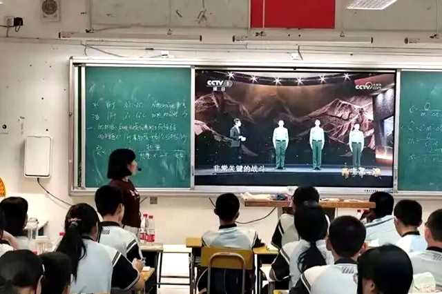 当晚夜幕初垂,各班教室灯火通明,气氛庄重而热烈,随着节目的展开,全体师生共同沉浸于那段波澜壮阔的历史长河。当“平型关大战突击连”“白刃格斗英雄连”“刘老庄连”的三面英雄战旗首次同台,指导员们动情讲述平型关大捷、百团大战等战役中先烈们不畏强暴、血战到底的英雄故事时,同学们无不为之动容;当延安革命纪念馆馆长展示华侨青年手绘的抗战画本,103岁的《黄河大合唱》首批演唱者孟于老人深情回忆延安岁月,并与现代学生合唱团跨越时空同台高歌时,激昂的旋律让许多同学热泪盈眶,教室内回荡着震撼人心的力量。从人民军队装备发展的辉煌历程到对杨靖宇、左权等英烈的深切缅怀,一帧帧画面、一段段讲述,将“铭记”二字深深镌刻在每个人心中。