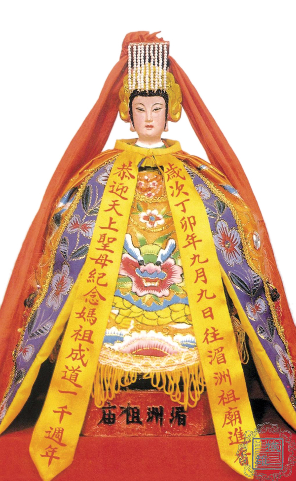 诚然,底座镌刻“湄洲祖庙”四个字,不仅是对神像归属的标注,也体现出历史与地域的文化符号。带有这一标识的妈祖像,承担着文化纽带的作用。如有尊底座刻有“湄洲祖庙”,袍服的黄色绸带上注有“岁次丁卯年九月九日往湄洲祖庙进香 恭迎天上圣母纪念妈祖成道一千周年”的妈祖像,阐明了1987年农历九月初九日,台湾台中大甲镇澜宫组团到湄洲祖庙参加纪念妈祖升天一千周年活动的史况。