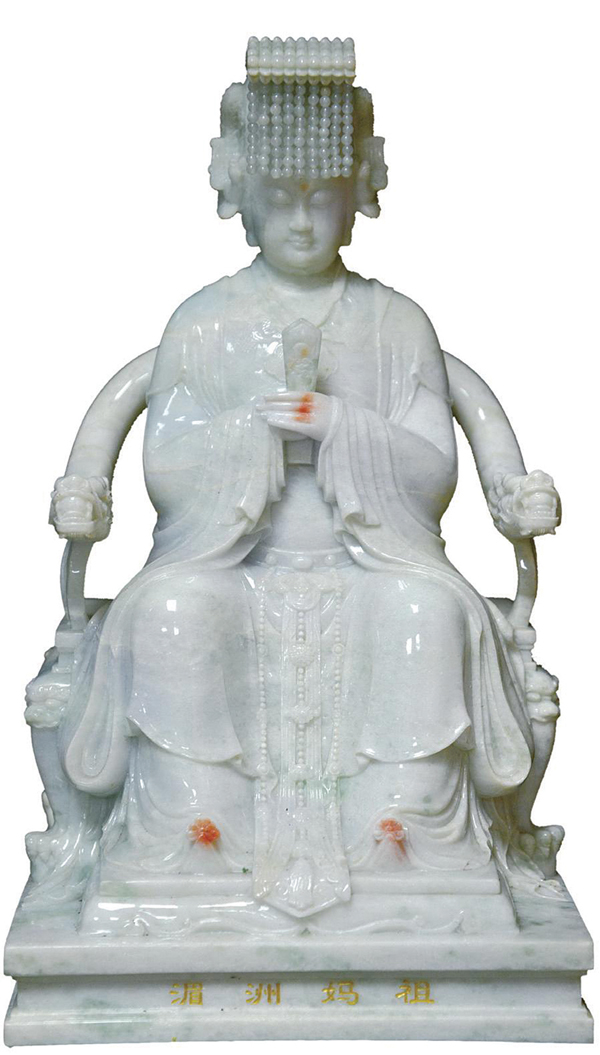 如今,妈祖像材质从木、石、泥、陶瓷到黄金、翡翠、铜合金、汉白玉、砗磲、刺绣、漆线雕、景泰蓝、珐琅彩等新工艺,一应俱全。底座刻有“湄洲妈祖”字样的广东深圳龙岗天后古庙玉雕妈祖像,头戴九旒冕冠,手持宝圭,身着袍服、肩披霞帔,彰显庄严,也表达出敬仰者对妈祖的无限虔诚和崇拜之情。玉雕妈祖像优美可亲的仪态,既延续了传统神像的庄严神圣,又融入了现代审美意趣。其慈祥面容、流畅衣纹与平和姿态,不仅展现工匠技艺的精湛,更折射出新时代民众对妈祖信俗的深刻理解。